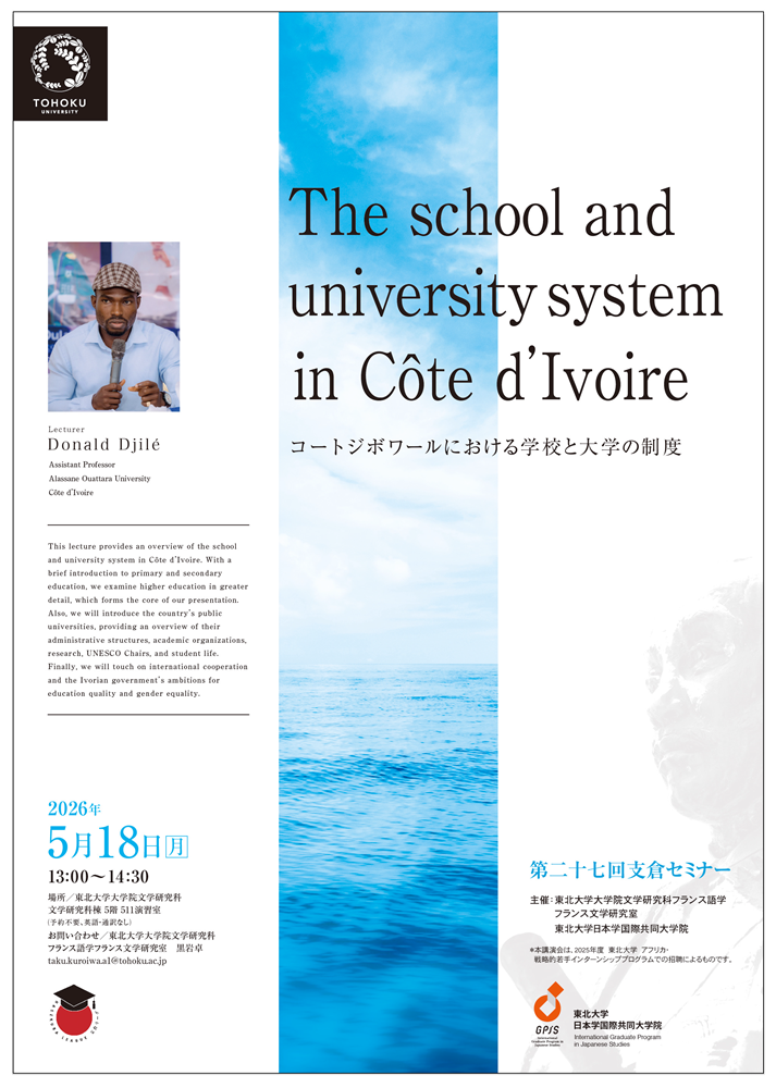 The 27th Hasekura Seminar The school and university system in Côte d’Ivoire Date May 18, 2026 1:00p.m.-2:30p.m. Place Room 511, Graduate School of Arts and Letters Building, Tohoku UniversityMAP Host Department of French Language and Literature, Tohoku University International Graduate Program in Japanese Studies(GPJS), Tohoku University Traffic Contents Lecturer: Donald Djilé Assistant Professor, Alassane Ouattara University, Côte d’Ivoire) Outline: This lecture provides an overview of the school and university system in Côte d’Ivoire. With a brief introduction to primary and secondary education, we examine higher education in greater detail, which forms the core of our presentation. Also, we will introduce the country’s public universities, providing an overview of their administrative structures, academic organizations, research, UNESCO Chairs, and student life. Finally, we will touch on international cooperation and the Ivorian government’s ambitions for education quality and gender equality. Language: English. No Interpretaion. Registration is not required. Contact